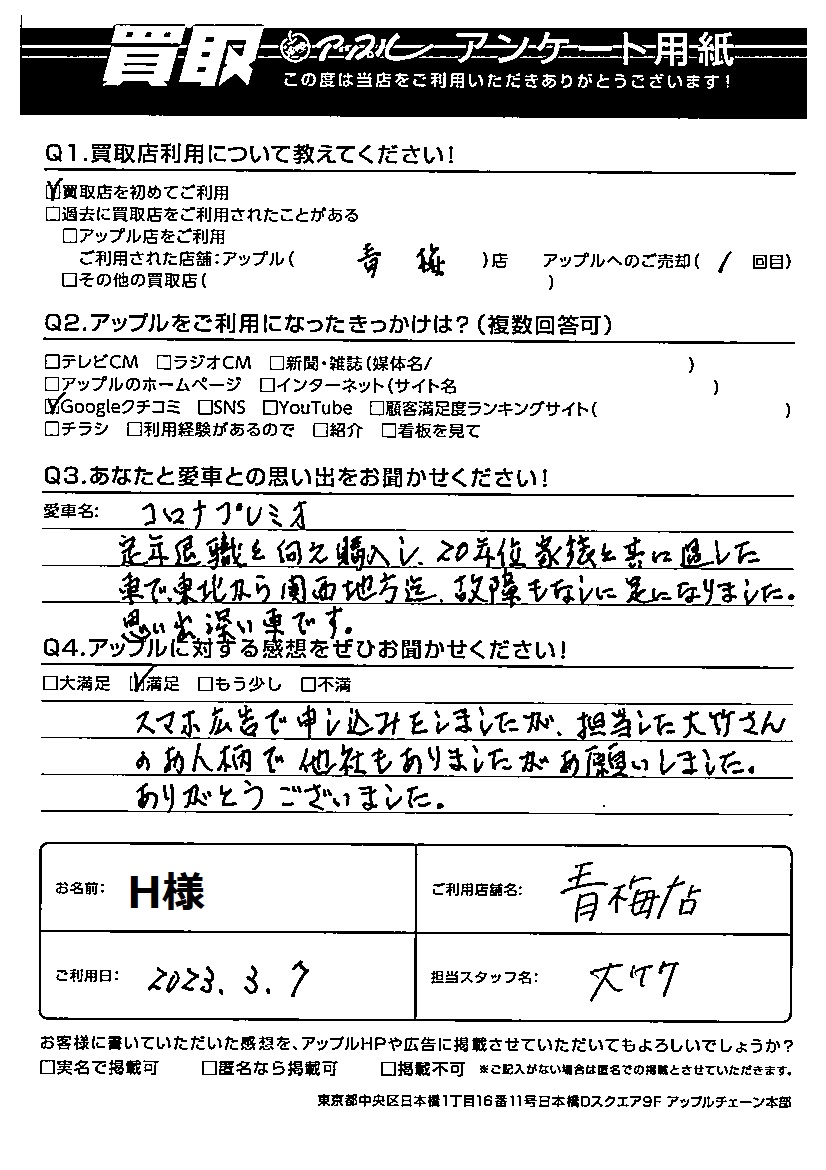 H様 車名:トヨタ コロナプレミオ