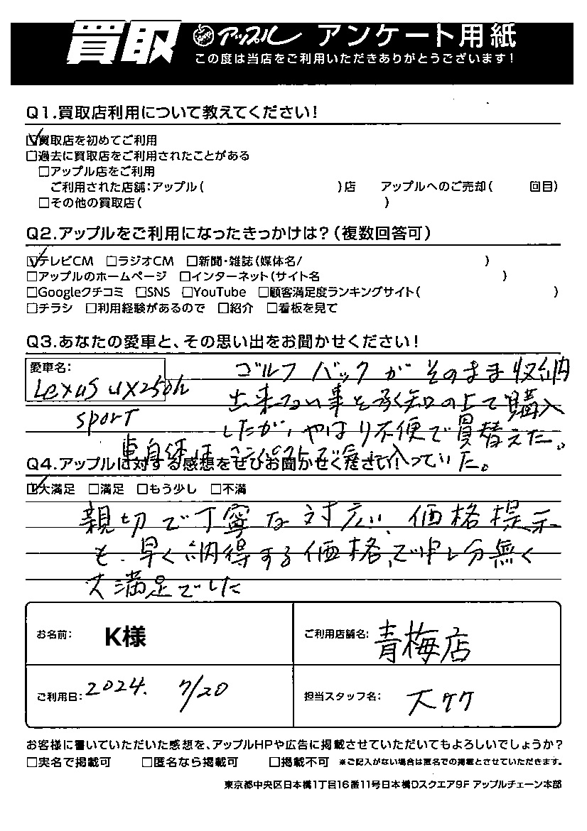 親切で丁寧な対応・価格提示も早く、納得する価格で申し分なく