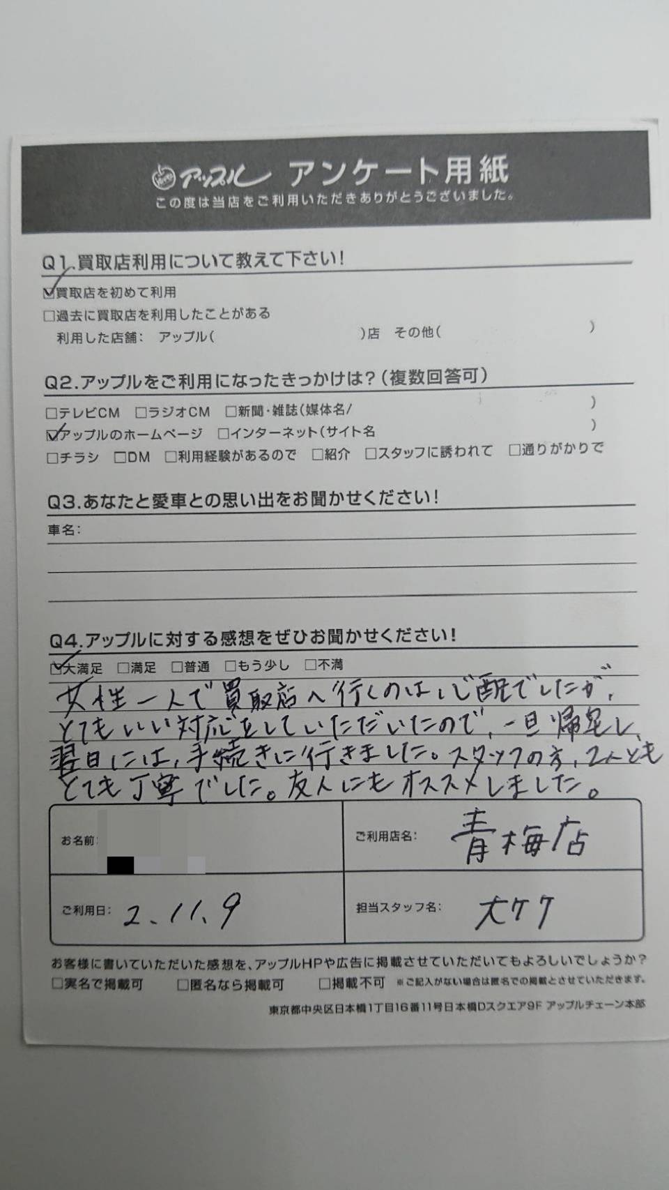 お車のご相談・ 査定だけでもOK! カンタン 入力 30秒 アップルがブランド買取始めました! お電話でも受付中! 受付時間10:00 ~ 19:00 0120-78-6610 お車のご相談・ 査定だけでもOK! カンタン 入力 30秒 アップルがブランド買取始めました! お電話でも受付中! 受付時間10:00 ~ 19:00 0120-78-6610 アップルがブランド買取始めました! お電話でも受付中! 受付時間10:00 ~ 19:00 0120-78-6610 店舗情報 在庫車 スタッフ紹介 ブログ お客様の声 キャンペーン 無料査定 click お客様の声 ご記入日: 2020/11/09 匿名希望様 車名:スズキ エブリイワゴン 女性一人で買取店へ行くのは心配でしたが、とてもいい対応をしていただいたので、一旦帰宅し翌日には手続きに行きました。スタッフの方、二人ともとても丁寧でした。友人にもオススメしました。 前へ 次へ お客様の声一覧を見る