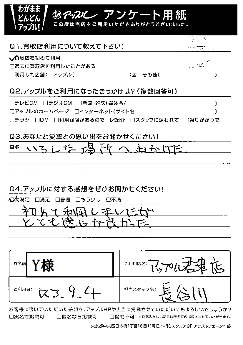 お車のご相談・ 査定だけでもOK! カンタン 入力 30秒 アップルがブランド買取始めました! お電話でも受付中! 受付時間10:00~18:00 0120-495-400 お車のご相談・ 査定だけでもOK! カンタン 入力 30秒 アップルがブランド買取始めました! お電話でも受付中! 受付時間10:00~18:00 0120-495-400 アップルがブランド買取始めました! お電話でも受付中! 受付時間10:00~18:00 0120-495-400 店舗情報 在庫車 スタッフ紹介 ブログ お客様の声 キャンペーン 無料査定 click お客様の声 ご記入日: 2021/09/23 Y様 Q あなたと愛車との思い出をお聞かせください!いろんな場所へ出かけたQ アップルに対する感想をぜひお聞かせください!感想:大満足初めて利用しましたがとても感じが良かった 前へ 次へ お客様の声一覧を見る