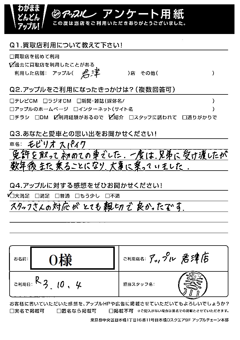O様 車名:ホンダ モビリオスパイク