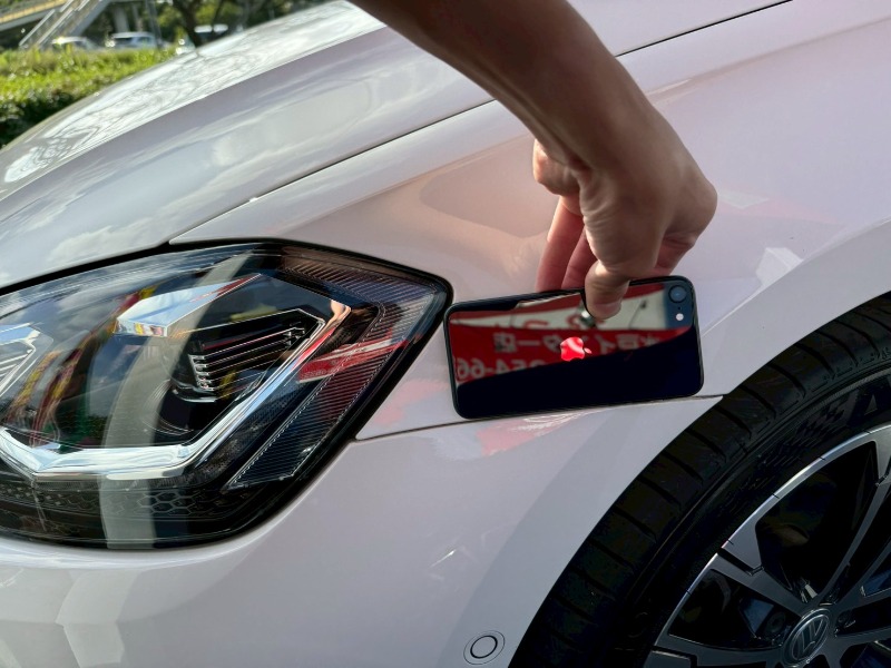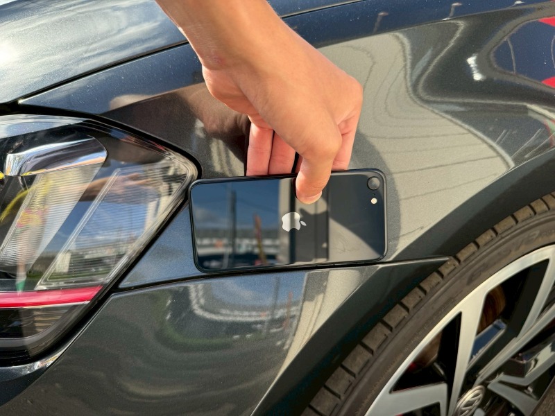 7の場合、ヘッドランプの端からタイヤハウス付近のプレスラインまでiPhoneの角が合うようなサイズ感ですが、
