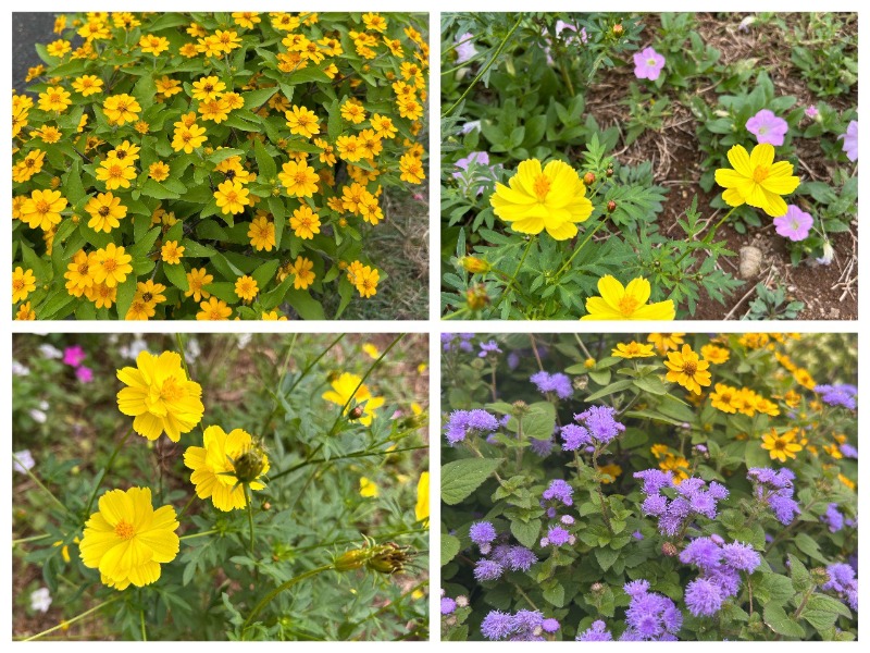 コキアのそばには、黄色いキバナコスモスや小さな紫の花も咲いていて、秋の彩りをよりいっそう引き立てていました。