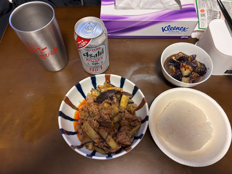 食卓には麻婆茄子、白ごはん、そして横には缶ビール。