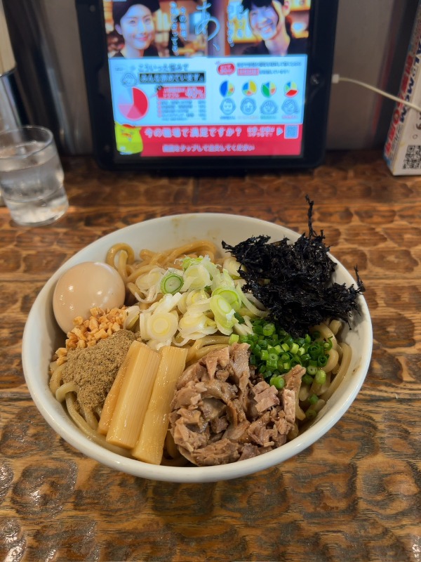 魚介の旨みがしっかり効いた濃厚ダレに、コシのある極太麺がしっかり絡みます。