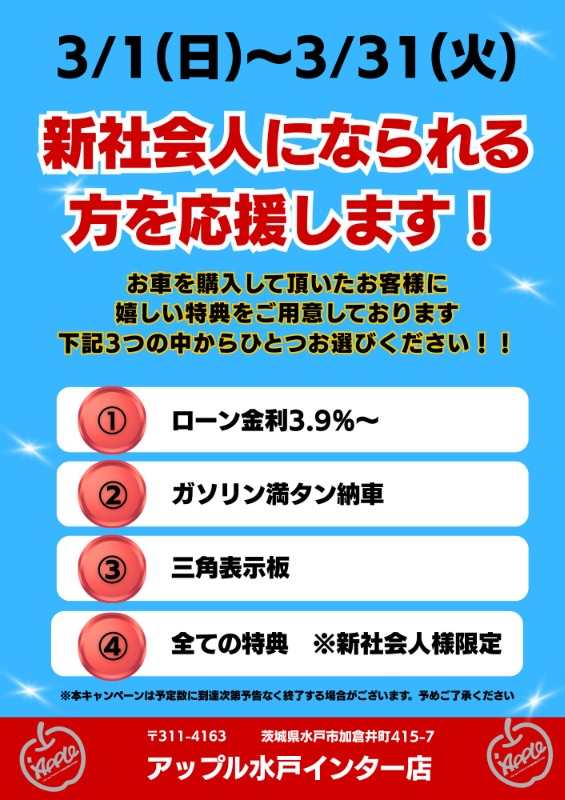 新社会人応援キャンペーン開催します!新生活のカーライフを全力でサポートします!