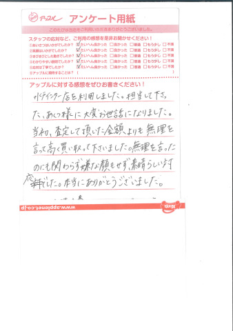 お車のご相談・ 査定だけでもOK! カンタン 入力 30秒 アップルがブランド買取始めました! お電話でも受付中! 受付時間10:00 ~ 18:30 0120-366-310 お車のご相談・ 査定だけでもOK! カンタン 入力 30秒 アップルがブランド買取始めました! お電話でも受付中! 受付時間10:00 ~ 18:30 0120-366-310 アップルがブランド買取始めました! お電話でも受付中! 受付時間10:00 ~ 18:30 0120-366-310 店舗情報 在庫車 スタッフ紹介 ブログ お客様の声 キャンペーン お得 無料査定 click お客様の声 ご記入日: 2013/11/15 Y.K様 水戸インター店を利用しました。担当してくださった、あくつ様に大変お世話になりました。当初、査定して頂いた金額よりも無理を言ったのにも関わらず嫌な顔もせず、素晴らしい対応でした。本当にありがとうございました。 前へ 次へ お客様の声一覧を見る