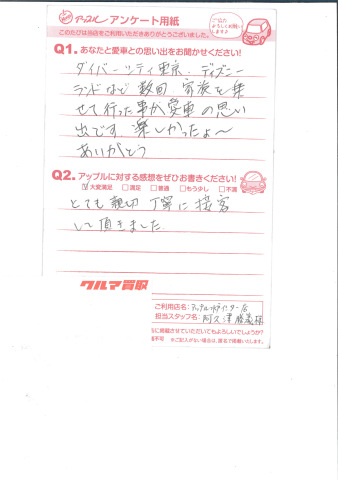 お車のご相談・ 査定だけでもOK! カンタン 入力 30秒 アップルがブランド買取始めました! お電話でも受付中! 受付時間10:00 ~ 18:30 0120-366-310 お車のご相談・ 査定だけでもOK! カンタン 入力 30秒 アップルがブランド買取始めました! お電話でも受付中! 受付時間10:00 ~ 18:30 0120-366-310 アップルがブランド買取始めました! お電話でも受付中! 受付時間10:00 ~ 18:30 0120-366-310 店舗情報 在庫車 スタッフ紹介 ブログ お客様の声 キャンペーン お得 無料査定 click お客様の声 ご記入日: 2014/07/04 Y.S様 ダイバーシティ東京、ディズニーランドなど数回、家族を乗せて行った事が愛車の思い出です。楽しかったょ~ ありがとうとても親切・丁寧に接客して頂きました。 前へ 次へ お客様の声一覧を見る
