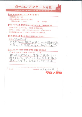 お車のご相談・ 査定だけでもOK! カンタン 入力 30秒 アップルがブランド買取始めました! お電話でも受付中! 受付時間10:00 ~ 18:30 0120-366-310 お車のご相談・ 査定だけでもOK! カンタン 入力 30秒 アップルがブランド買取始めました! お電話でも受付中! 受付時間10:00 ~ 18:30 0120-366-310 アップルがブランド買取始めました! お電話でも受付中! 受付時間10:00 ~ 18:30 0120-366-310 店舗情報 在庫車 スタッフ紹介 ブログ お客様の声 キャンペーン お得 無料査定 click お客様の声 ご記入日: 2014/10/17 K.K様 とても私と相性が良く、20年間乗りました。大雪の日も不安のない車でした。親切な対応で、丁寧な説明をして頂きました。水戸インター店を利用して良かったです。ありがとうございました。 前へ 次へ お客様の声一覧を見る