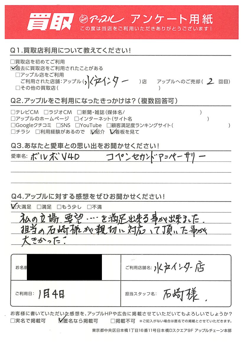お車のご相談・ 査定だけでもOK! カンタン 入力 30秒 アップルがブランド買取始めました! お電話でも受付中! 受付時間10:00 ~ 18:30 0120-366-310 お車のご相談・ 査定だけでもOK! カンタン 入力 30秒 アップルがブランド買取始めました! お電話でも受付中! 受付時間10:00 ~ 18:30 0120-366-310 アップルがブランド買取始めました! お電話でも受付中! 受付時間10:00 ~ 18:30 0120-366-310 店舗情報 在庫車 スタッフ紹介 ブログ お客様の声 キャンペーン お得 無料査定 click お客様の声 ご記入日: 2023/01/04 水戸市 K様 車名:ボルボ V40 【貴方と愛車との思い出をお聞かせください。】ボルボV40 コペンセカンドアニバーサリー【アップルに対する感想をぜひお聞かせください。】私の立場、要望・・・を満足できることができました。担当の石崎様が親切に対応して頂いた事が大きかった 前へ 次へ お客様の声一覧を見る