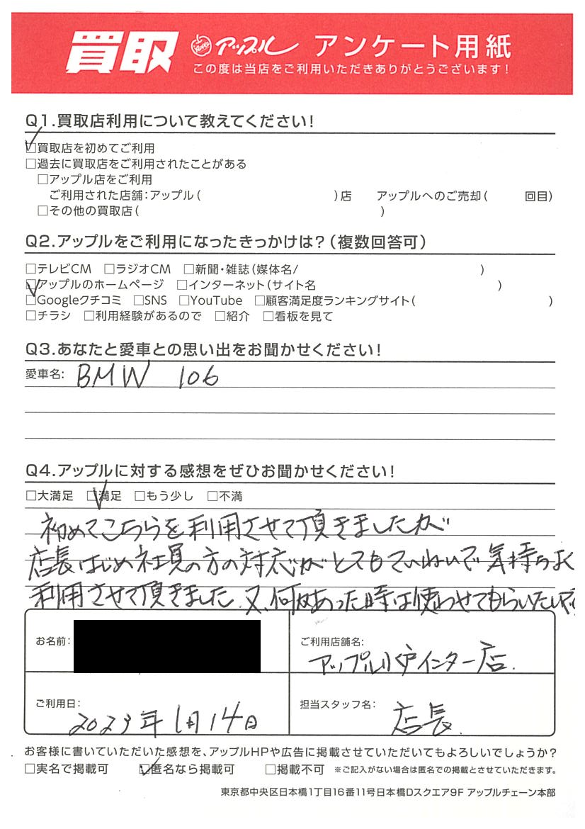 お車のご相談・ 査定だけでもOK! カンタン 入力 30秒 アップルがブランド買取始めました! お電話でも受付中! 受付時間10:00 ~ 18:30 0120-366-310 お車のご相談・ 査定だけでもOK! カンタン 入力 30秒 アップルがブランド買取始めました! お電話でも受付中! 受付時間10:00 ~ 18:30 0120-366-310 アップルがブランド買取始めました! お電話でも受付中! 受付時間10:00 ~ 18:30 0120-366-310 店舗情報 在庫車 スタッフ紹介 ブログ お客様の声 キャンペーン お得 無料査定 click お客様の声 ご記入日: 2023/01/14 水戸市 A様 車名:BMW 1シリーズ 【アップルに対する感想をぜひお聞かせください。】BMW 106【アップルに対する感想をぜひお聞かせください。】はじめてこちらを利用させて頂きましたが店長をはじめ社員の方の対応がとてもていねいで気持ちよく利用させて頂きました。又何かあった時は使わせてもらいたいです 前へ 次へ お客様の声一覧を見る