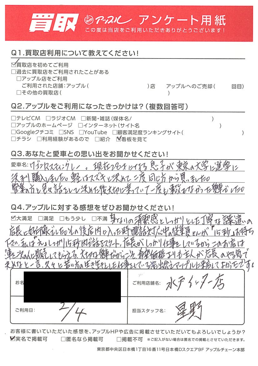 お車のご相談・ 査定だけでもOK! カンタン 入力 30秒 アップルがブランド買取始めました! お電話でも受付中! 受付時間10:00 ~ 18:30 0120-366-310 お車のご相談・ 査定だけでもOK! カンタン 入力 30秒 アップルがブランド買取始めました! お電話でも受付中! 受付時間10:00 ~ 18:30 0120-366-310 アップルがブランド買取始めました! お電話でも受付中! 受付時間10:00 ~ 18:30 0120-366-310 店舗情報 在庫車 スタッフ紹介 ブログ お客様の声 キャンペーン お得 無料査定 click お客様の声 ご記入日: 2023/02/04 水戸市 K様 車名:トヨタ エスクァイア 【貴方と愛車との思い出をお聞かせください。】下のこどもが生まれた時にかいました。家族でお出かけをしたり沢山の思い出ができました【アップルに対する感想をぜひお聞かせください。】親切に対応していただきありがとうございましたまたよろしくお願いいたします。 前へ 次へ お客様の声一覧を見る