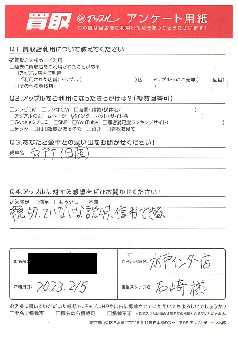 お車のご相談・ 査定だけでもOK! カンタン 入力 30秒 アップルがブランド買取始めました! お電話でも受付中! 受付時間10:00 ~ 18:30 0120-366-310 お車のご相談・ 査定だけでもOK! カンタン 入力 30秒 アップルがブランド買取始めました! お電話でも受付中! 受付時間10:00 ~ 18:30 0120-366-310 アップルがブランド買取始めました! お電話でも受付中! 受付時間10:00 ~ 18:30 0120-366-310 店舗情報 在庫車 スタッフ紹介 ブログ お客様の声 キャンペーン お得 無料査定 click お客様の声 ご記入日: 2023/02/15 水戸市 O様 車名:日産 ティアナ 【貴方と愛車との思い出をお聞かせください。】ティアナ(日産)【アップルに対する感想をぜひお聞かせください。】親切ていねいな説明、信用できる 前へ 次へ お客様の声一覧を見る