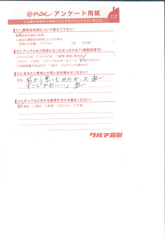 お車のご相談・ 査定だけでもOK! カンタン 入力 30秒 アップルがブランド買取始めました! お電話でも受付中! 受付時間10:00 ~ 18:30 0120-366-310 お車のご相談・ 査定だけでもOK! カンタン 入力 30秒 アップルがブランド買取始めました! お電話でも受付中! 受付時間10:00 ~ 18:30 0120-366-310 アップルがブランド買取始めました! お電話でも受付中! 受付時間10:00 ~ 18:30 0120-366-310 店舗情報 在庫車 スタッフ紹介 ブログ お客様の声 キャンペーン お得 無料査定 click お客様の声 ご記入日: 2014/12/23 S.H様 前から乗ってみたかった車!すごく『かわいい』車 前へ 次へ お客様の声一覧を見る