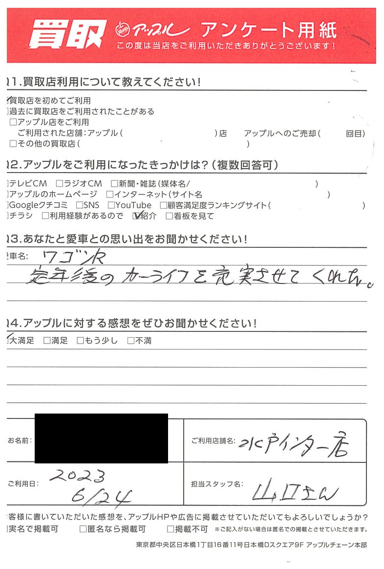 お車のご相談・ 査定だけでもOK! カンタン 入力 30秒 アップルがブランド買取始めました! お電話でも受付中! 受付時間10:00 ~ 18:30 0120-366-310 お車のご相談・ 査定だけでもOK! カンタン 入力 30秒 アップルがブランド買取始めました! お電話でも受付中! 受付時間10:00 ~ 18:30 0120-366-310 アップルがブランド買取始めました! お電話でも受付中! 受付時間10:00 ~ 18:30 0120-366-310 店舗情報 在庫車 スタッフ紹介 ブログ お客様の声 キャンペーン お得 無料査定 click お客様の声 ご記入日: 2023/06/24 水戸市 K様 車名:スズキ ワゴンR 【貴方と愛車との思い出をお聞かせください。】定年後のカーライフを充実させてくれた【アップルに対する感想をぜひお聞かせください。】 前へ 次へ お客様の声一覧を見る