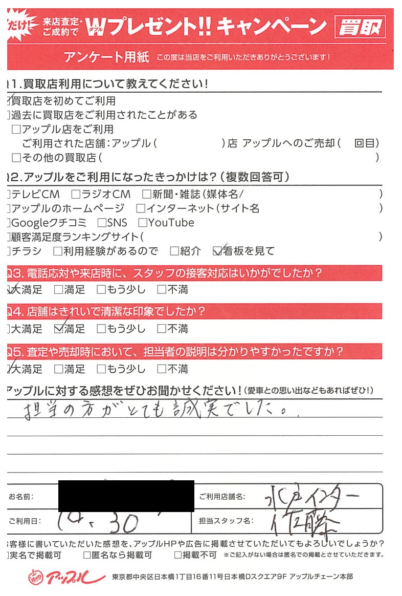 お車のご相談・ 査定だけでもOK! カンタン 入力 30秒 アップルがブランド買取始めました! お電話でも受付中! 受付時間10:00 ~ 18:30 0120-366-310 お車のご相談・ 査定だけでもOK! カンタン 入力 30秒 アップルがブランド買取始めました! お電話でも受付中! 受付時間10:00 ~ 18:30 0120-366-310 アップルがブランド買取始めました! お電話でも受付中! 受付時間10:00 ~ 18:30 0120-366-310 店舗情報 在庫車 スタッフ紹介 ブログ お客様の声 キャンペーン お得 無料査定 click お客様の声 ご記入日: 2023/10/30 水戸市 S様 車名:フォルクスワーゲン ゴルフトゥーラン 【アップルに対する感想をぜひお聞かせください。】担当の方でとても誠実でした。 前へ 次へ お客様の声一覧を見る