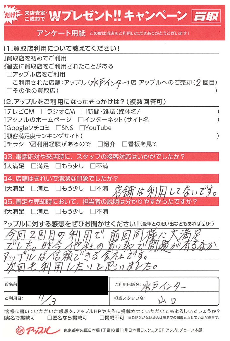 お車のご相談・ 査定だけでもOK! カンタン 入力 30秒 アップルがブランド買取始めました! お電話でも受付中! 受付時間10:00 ~ 18:30 0120-366-310 お車のご相談・ 査定だけでもOK! カンタン 入力 30秒 アップルがブランド買取始めました! お電話でも受付中! 受付時間10:00 ~ 18:30 0120-366-310 アップルがブランド買取始めました! お電話でも受付中! 受付時間10:00 ~ 18:30 0120-366-310 店舗情報 在庫車 スタッフ紹介 ブログ お客様の声 キャンペーン お得 無料査定 click お客様の声 ご記入日: 2023/11/03 笠間市 K様 車名:フォルクスワーゲン ザ・ビートル 【アップルに対する感想をぜひお聞かせください。】今回2回目の利用で前回同様に大満足でした。昨今他社の買取で問題が有るなかアップルは信頼できる会社です。次回も利用したいと思いました。 前へ 次へ お客様の声一覧を見る