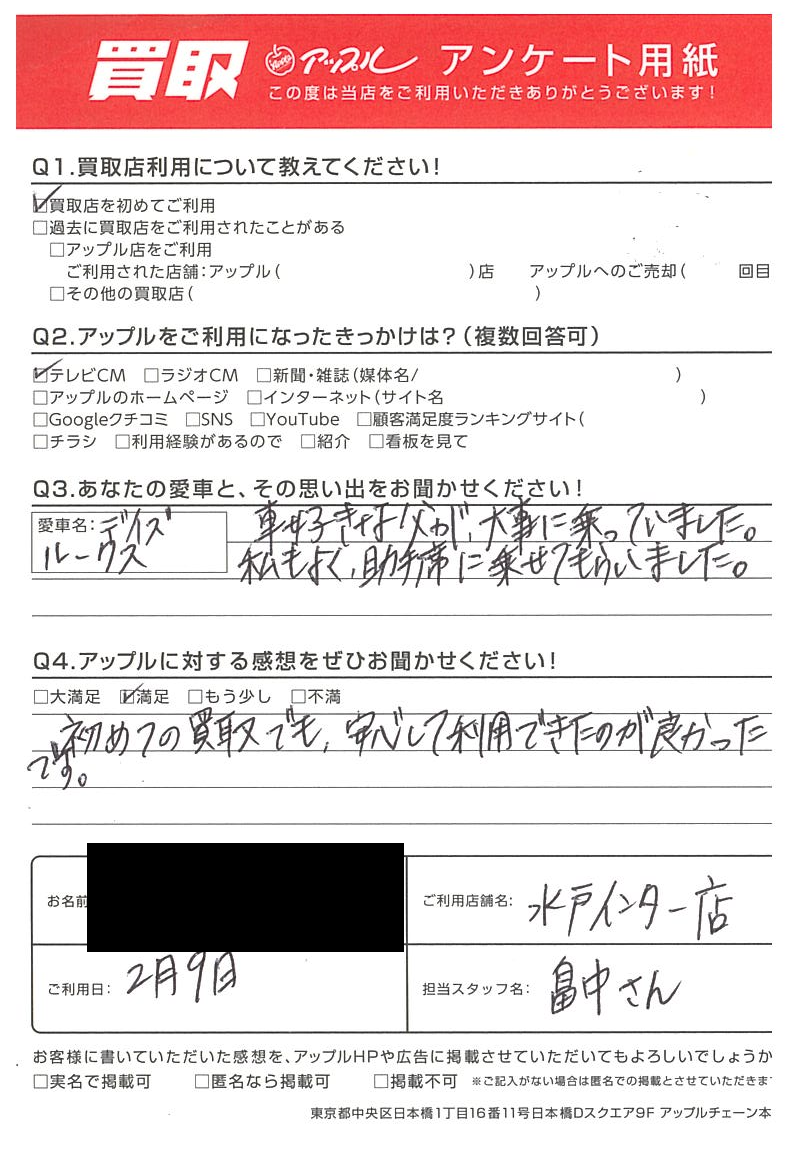 お車のご相談・ 査定だけでもOK! カンタン 入力 30秒 アップルがブランド買取始めました! お電話でも受付中! 受付時間10:00 ~ 18:30 0120-366-310 お車のご相談・ 査定だけでもOK! カンタン 入力 30秒 アップルがブランド買取始めました! お電話でも受付中! 受付時間10:00 ~ 18:30 0120-366-310 アップルがブランド買取始めました! お電話でも受付中! 受付時間10:00 ~ 18:30 0120-366-310 店舗情報 在庫車 スタッフ紹介 ブログ お客様の声 キャンペーン お得 無料査定 click お客様の声 ご記入日: 2024/02/09 水戸市 s様 車名:日産 デイズルークス 【貴方と愛車との思い出をお聞かせください。】車好きな父が大事に乗っていました。私もよく、助手席に乗せてもらいました。【アップルに対する感想をぜひお聞かせください。】初めての買取でも、安心して利用できたのがよかったです。 前へ 次へ お客様の声一覧を見る