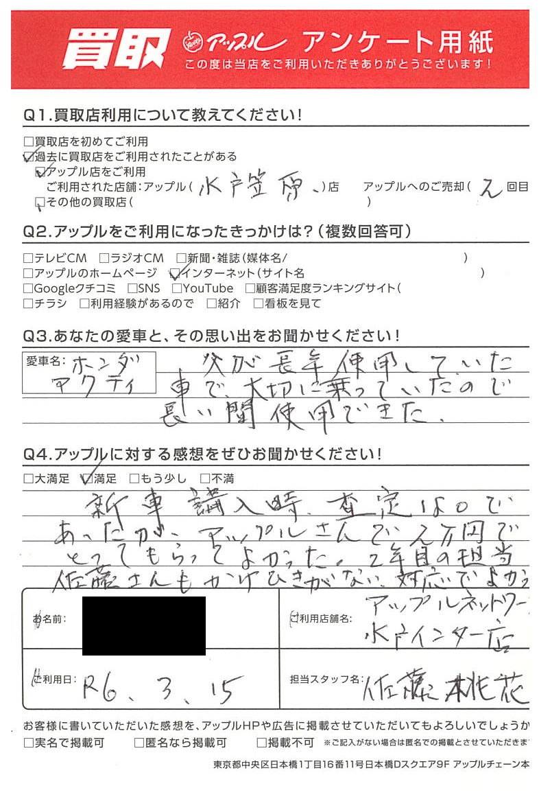 新車購入時、査定はで0あったが、アップルさんで2万円でとってもらってよかった。