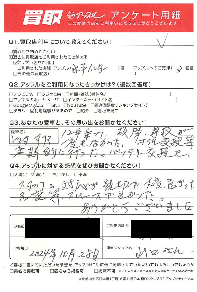 お車のご相談・ 査定だけでもOK! カンタン 入力 30秒 アップルがブランド買取始めました! お電話でも受付中! 受付時間10:00 ~ 18:30 0120-366-310 お車のご相談・ 査定だけでもOK! カンタン 入力 30秒 アップルがブランド買取始めました! お電話でも受付中! 受付時間10:00 ~ 18:30 0120-366-310 アップルがブランド買取始めました! お電話でも受付中! 受付時間10:00 ~ 18:30 0120-366-310 店舗情報 在庫車 スタッフ紹介 ブログ お客様の声 キャンペーン お得 無料査定 click お客様の声 ご記入日: 2024/10/28 水戸市 S様 車名:トヨタ アクア 【貴方と愛車との思い出をお聞かせください。】12年間、故障・事故が1度もなかった。オイル交換等も定期的に行った。バッテリー交換も【アップルに対する感想をぜひお聞かせください。】スタッフの対応が親切丁寧で大変良かった。名変等、スムーズで良かった。ありがとうございました。 前へ 次へ お客様の声一覧を見る