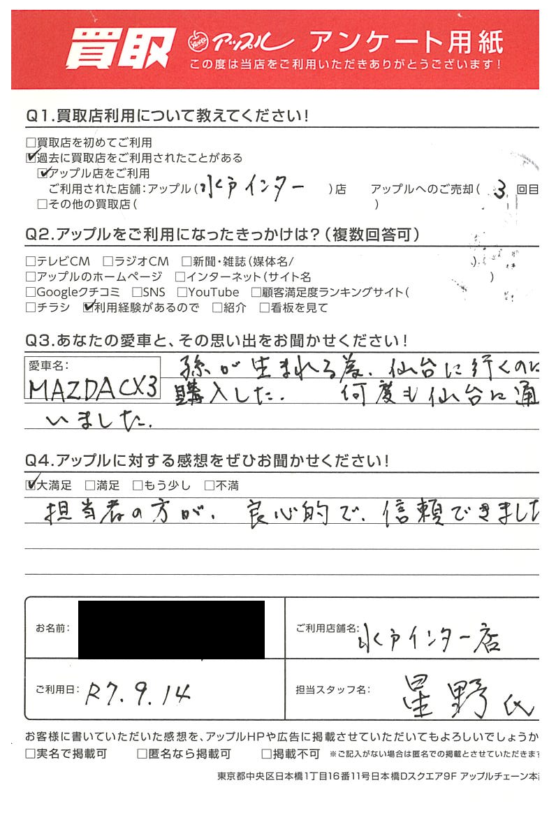 お車のご相談・ 査定だけでもOK! カンタン 入力 30秒 アップルがブランド買取始めました! お電話でも受付中! 受付時間10:00 ~ 18:30 0120-366-310 お車のご相談・ 査定だけでもOK! カンタン 入力 30秒 アップルがブランド買取始めました! お電話でも受付中! 受付時間10:00 ~ 18:30 0120-366-310 アップルがブランド買取始めました! お電話でも受付中! 受付時間10:00 ~ 18:30 0120-366-310 店舗情報 在庫車 スタッフ紹介 ブログ お客様の声 キャンペーン お得 無料査定 click お客様の声 ご記入日: 2025/09/14 那珂市 K様 車名:マツダ CX-3 【貴方と愛車との思い出をお聞かせください。】孫が生まれる為仙台に行くのに購入しました。何度も仙台に通いました。【アップルに対する感想をぜひお聞かせください。】担当者の方が、良心的で信頼できました。 前へ 次へ お客様の声一覧を見る