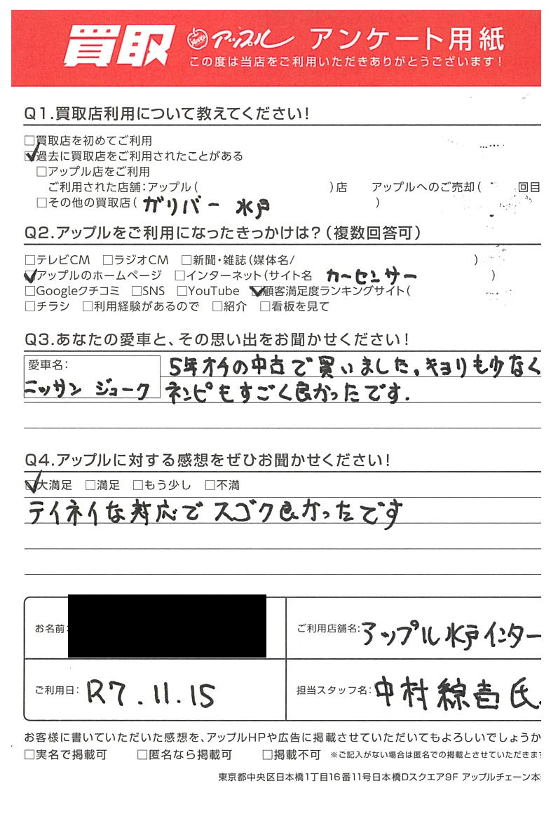 お車のご相談・ 査定だけでもOK! カンタン 入力 30秒 アップルがブランド買取始めました! お電話でも受付中! 受付時間10:00 ~ 18:30 0120-366-310 お車のご相談・ 査定だけでもOK! カンタン 入力 30秒 アップルがブランド買取始めました! お電話でも受付中! 受付時間10:00 ~ 18:30 0120-366-310 アップルがブランド買取始めました! お電話でも受付中! 受付時間10:00 ~ 18:30 0120-366-310 店舗情報 在庫車 スタッフ紹介 ブログ お客様の声 キャンペーン お得 無料査定 click お客様の声 ご記入日: 2025/11/15 那珂市 W様 車名:日産 ジューク 【貴方と愛車との思い出をお聞かせください。】5年オチの中古で買いました。キョリも少なくネンピもスゴク良かったです。【アップルに対する感想をぜひお聞かせください。】テイネイな対応でスゴク良かったです。 前へ 次へ お客様の声一覧を見る
