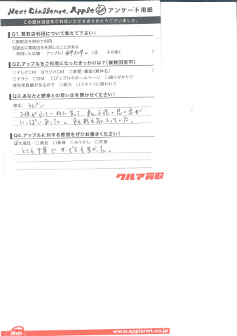 お車のご相談・ 査定だけでもOK! カンタン 入力 30秒 アップルがブランド買取始めました! お電話でも受付中! 受付時間10:00 ~ 18:30 0120-366-310 お車のご相談・ 査定だけでもOK! カンタン 入力 30秒 アップルがブランド買取始めました! お電話でも受付中! 受付時間10:00 ~ 18:30 0120-366-310 アップルがブランド買取始めました! お電話でも受付中! 受付時間10:00 ~ 18:30 0120-366-310 店舗情報 在庫車 スタッフ紹介 ブログ お客様の声 キャンペーン お得 無料査定 click お客様の声 ご記入日: 2015/08/06 K.W様 子供が小さい時に買って、車と子供の思い出がいっぱいあった。 色も形も気に入っていた。とても丁寧でサービスも良かった。 前へ 次へ お客様の声一覧を見る