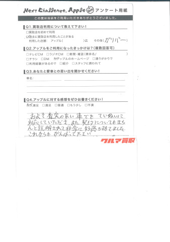 お車のご相談・ 査定だけでもOK! カンタン 入力 30秒 アップルがブランド買取始めました! お電話でも受付中! 受付時間10:00 ~ 18:30 0120-366-310 お車のご相談・ 査定だけでもOK! カンタン 入力 30秒 アップルがブランド買取始めました! お電話でも受付中! 受付時間10:00 ~ 18:30 0120-366-310 アップルがブランド買取始めました! お電話でも受付中! 受付時間10:00 ~ 18:30 0120-366-310 店舗情報 在庫車 スタッフ紹介 ブログ お客様の声 キャンペーン お得 無料査定 click お客様の声 ご記入日: 2015/09/03 Y.S様 およそ査定のない車でも、ていねいに対応していただき、また、契約についてもきちんと説明されて非常に好感がもてました。これからもがんばって下さい。 前へ 次へ お客様の声一覧を見る