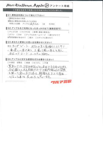 お車のご相談・ 査定だけでもOK! カンタン 入力 30秒 アップルがブランド買取始めました! お電話でも受付中! 受付時間10:00 ~ 18:30 0120-366-310 お車のご相談・ 査定だけでもOK! カンタン 入力 30秒 アップルがブランド買取始めました! お電話でも受付中! 受付時間10:00 ~ 18:30 0120-366-310 アップルがブランド買取始めました! お電話でも受付中! 受付時間10:00 ~ 18:30 0120-366-310 店舗情報 在庫車 スタッフ紹介 ブログ お客様の声 キャンペーン お得 無料査定 click お客様の声 ご記入日: 2015/10/11 Y.M様 ホンダビート、かなりの車を乗換えてきた中で一番楽しい車であり、又、乗って楽しい車をと考え今回のアコード、ユーロRに決めた。買取りでは、2台お世話になり今回で3台目になります。今回購入を決めた車輛アコードの前所有者の方の詳細を聞いて安心出来た事は、結論を出す上で参考になった事はよかったと思います。 前へ 次へ お客様の声一覧を見る