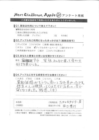 お車のご相談・ 査定だけでもOK! カンタン 入力 30秒 アップルがブランド買取始めました! お電話でも受付中! 受付時間10:00 ~ 18:30 0120-366-310 お車のご相談・ 査定だけでもOK! カンタン 入力 30秒 アップルがブランド買取始めました! お電話でも受付中! 受付時間10:00 ~ 18:30 0120-366-310 アップルがブランド買取始めました! お電話でも受付中! 受付時間10:00 ~ 18:30 0120-366-310 店舗情報 在庫車 スタッフ紹介 ブログ お客様の声 キャンペーン お得 無料査定 click お客様の声 ご記入日: 2015/11/20 Y様 家族みんなで乗って母が大好きな車でした。買取価格がもう少し高いと、なお良かったです。担当の人は頑張ってくれたけど店長の一言で安くなりました。残念。(泣) 前へ 次へ お客様の声一覧を見る