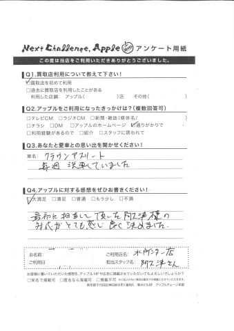 お車のご相談・ 査定だけでもOK! カンタン 入力 30秒 アップルがブランド買取始めました! お電話でも受付中! 受付時間10:00 ~ 18:30 0120-366-310 お車のご相談・ 査定だけでもOK! カンタン 入力 30秒 アップルがブランド買取始めました! お電話でも受付中! 受付時間10:00 ~ 18:30 0120-366-310 アップルがブランド買取始めました! お電話でも受付中! 受付時間10:00 ~ 18:30 0120-366-310 店舗情報 在庫車 スタッフ紹介 ブログ お客様の声 キャンペーン お得 無料査定 click お客様の声 ご記入日: 2015/12/11 M様 毎週洗車していました。最初に担当して頂いた阿久津様の対応がとても感じ良く決めました。 前へ 次へ お客様の声一覧を見る