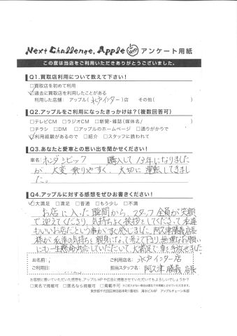 お店に入った瞬間からスタッフ全員が笑顔で迎えてくださり、気持ちよく挨拶をしてくださって私達もいいお店だという事がすぐ感じました。阿久津店長様が私達の気持ちを親身になって考えて下さり無理なお願いにも一生懸命対応していただいて大満足で車を手放せました。