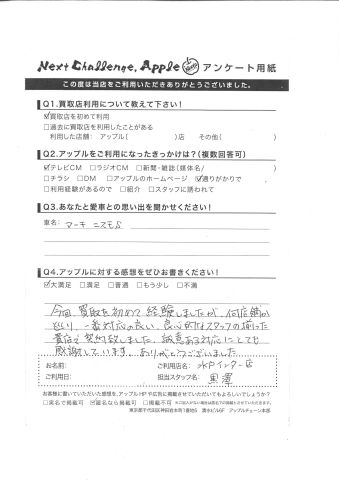 お車のご相談・ 査定だけでもOK! カンタン 入力 30秒 アップルがブランド買取始めました! お電話でも受付中! 受付時間10:00 ~ 18:30 0120-366-310 お車のご相談・ 査定だけでもOK! カンタン 入力 30秒 アップルがブランド買取始めました! お電話でも受付中! 受付時間10:00 ~ 18:30 0120-366-310 アップルがブランド買取始めました! お電話でも受付中! 受付時間10:00 ~ 18:30 0120-366-310 店舗情報 在庫車 スタッフ紹介 ブログ お客様の声 キャンペーン お得 無料査定 click お客様の声 ご記入日: 2016/01/29 K様 今回、買取を初めて経験しましたが、何店舗か巡り一番対応の良い、良心的なスタッフの揃った貴店で契約致しました。誠意ある対応にとても感謝しています。ありがとうございました。 前へ 次へ お客様の声一覧を見る