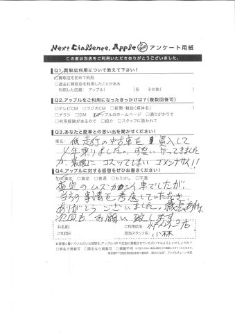 お車のご相談・ 査定だけでもOK! カンタン 入力 30秒 アップルがブランド買取始めました! お電話でも受付中! 受付時間10:00 ~ 18:30 0120-366-310 お車のご相談・ 査定だけでもOK! カンタン 入力 30秒 アップルがブランド買取始めました! お電話でも受付中! 受付時間10:00 ~ 18:30 0120-366-310 アップルがブランド買取始めました! お電話でも受付中! 受付時間10:00 ~ 18:30 0120-366-310 店舗情報 在庫車 スタッフ紹介 ブログ お客様の声 キャンペーン お得 無料査定 click お客様の声 ご記入日: 2016/03/01 K様 低走行の中古車を買入して4年乗りました。可愛がってきましたが最後にコスってしまいゴメンナサイ!!査定のムズカシイ車でしたが、当方の事情を考慮していただきありがとうございました。機会があれば次回もお願い致します。 前へ 次へ お客様の声一覧を見る