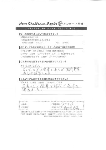 お車のご相談・ 査定だけでもOK! カンタン 入力 30秒 アップルがブランド買取始めました! お電話でも受付中! 受付時間10:00 ~ 18:30 0120-366-310 お車のご相談・ 査定だけでもOK! カンタン 入力 30秒 アップルがブランド買取始めました! お電話でも受付中! 受付時間10:00 ~ 18:30 0120-366-310 アップルがブランド買取始めました! お電話でも受付中! 受付時間10:00 ~ 18:30 0120-366-310 店舗情報 在庫車 スタッフ紹介 ブログ お客様の声 キャンペーン お得 無料査定 click お客様の声 ご記入日: 2016/04/15 I様 亡くなった父の愛車であるが維持費等考え手放すことに。店長さんの親身な対応で売却を決めました。 前へ 次へ お客様の声一覧を見る