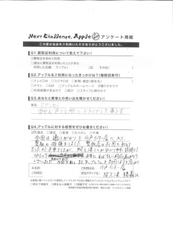 お車のご相談・ 査定だけでもOK! カンタン 入力 30秒 アップルがブランド買取始めました! お電話でも受付中! 受付時間10:00 ~ 18:30 0120-366-310 お車のご相談・ 査定だけでもOK! カンタン 入力 30秒 アップルがブランド買取始めました! お電話でも受付中! 受付時間10:00 ~ 18:30 0120-366-310 アップルがブランド買取始めました! お電話でも受付中! 受付時間10:00 ~ 18:30 0120-366-310 店舗情報 在庫車 スタッフ紹介 ブログ お客様の声 キャンペーン お得 無料査定 click お客様の声 ご記入日: 2016/04/22 K様 彼女と色々な所にドライブした事です。今回は通りがかりで水戸インター店に入り、買取の相談をしました。買取店の利用も初めてだったので不安でしたが、阿久津さんが分かりやすく説明してくれたので助かりました。本当にすばらしい対応ありがとうございました。今回を期にまたアップルさんを利用しようと思いました。 前へ 次へ お客様の声一覧を見る