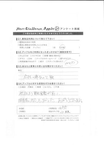 お車のご相談・ 査定だけでもOK! カンタン 入力 30秒 アップルがブランド買取始めました! お電話でも受付中! 受付時間10:00 ~ 18:30 0120-366-310 お車のご相談・ 査定だけでもOK! カンタン 入力 30秒 アップルがブランド買取始めました! お電話でも受付中! 受付時間10:00 ~ 18:30 0120-366-310 アップルがブランド買取始めました! お電話でも受付中! 受付時間10:00 ~ 18:30 0120-366-310 店舗情報 在庫車 スタッフ紹介 ブログ お客様の声 キャンペーン お得 無料査定 click お客様の声 ご記入日: 2016/05/03 匿名希望様様 Q.あなたと愛車との思い出を聞かせてください!車名:会社の車なので無Q.アップルに対する感想をぜひお書きください!他社より買取金額が高い。担当者の対応もよかった。ありがとうございました。 前へ 次へ お客様の声一覧を見る