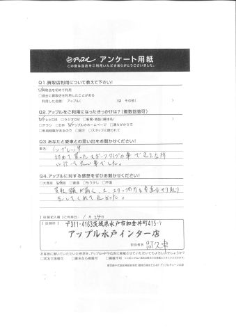お車のご相談・ 査定だけでもOK! カンタン 入力 30秒 アップルがブランド買取始めました! お電話でも受付中! 受付時間10:00 ~ 18:30 0120-366-310 お車のご相談・ 査定だけでもOK! カンタン 入力 30秒 アップルがブランド買取始めました! お電話でも受付中! 受付時間10:00 ~ 18:30 0120-366-310 アップルがブランド買取始めました! お電話でも受付中! 受付時間10:00 ~ 18:30 0120-366-310 店舗情報 在庫車 スタッフ紹介 ブログ お客様の声 キャンペーン お得 無料査定 click お客様の声 ご記入日: 2016/09/18 F様 Q.あなたと愛車との思い出をお聞かせください!インプレッサ初めて買ったスポーツタイプの車で色々な所に行って良い車でした。Q.アップルに対する感想をぜひお書きください!買取額が高く、又、スタッフの方も素直なやり取りをしてくれて良かった。担当スタッフ:阿久津 前へ 次へ お客様の声一覧を見る