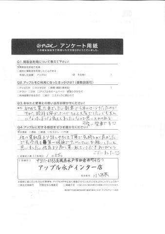 他の買取店より話しやすくて丁寧で気持ちが良かったです。今後も第一候補でアップルさんにお願いしたいと思いました。他店より高く買い取っていただきありがとうございました(^-^)