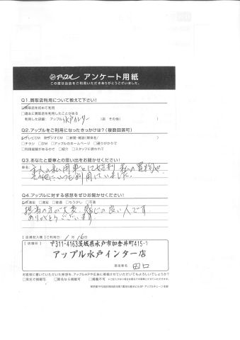 お車のご相談・ 査定だけでもOK! カンタン 入力 30秒 アップルがブランド買取始めました! お電話でも受付中! 受付時間10:00 ~ 18:30 0120-366-310 お車のご相談・ 査定だけでもOK! カンタン 入力 30秒 アップルがブランド買取始めました! お電話でも受付中! 受付時間10:00 ~ 18:30 0120-366-310 アップルがブランド買取始めました! お電話でも受付中! 受付時間10:00 ~ 18:30 0120-366-310 店舗情報 在庫車 スタッフ紹介 ブログ お客様の声 キャンペーン お得 無料査定 click お客様の声 ご記入日: 2016/10/31 C様 Q.あなたと愛車との思い出をお聞かせください!主人の私用車として始まり、私の買物やその他にいつも利用していました。Q.アップルに対する感想をぜひお書きください!担当の方が大変感じの良い人です。ありがとうございます。担当スタッフ:田口 前へ 次へ お客様の声一覧を見る