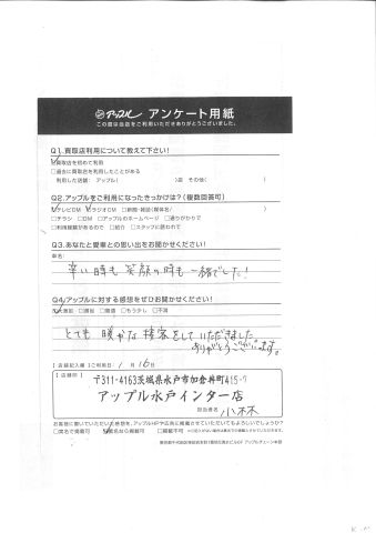 お車のご相談・ 査定だけでもOK! カンタン 入力 30秒 アップルがブランド買取始めました! お電話でも受付中! 受付時間10:00 ~ 18:30 0120-366-310 お車のご相談・ 査定だけでもOK! カンタン 入力 30秒 アップルがブランド買取始めました! お電話でも受付中! 受付時間10:00 ~ 18:30 0120-366-310 アップルがブランド買取始めました! お電話でも受付中! 受付時間10:00 ~ 18:30 0120-366-310 店舗情報 在庫車 スタッフ紹介 ブログ お客様の声 キャンペーン お得 無料査定 click お客様の声 ご記入日: 2016/11/30 K.M様 Q.あなたと愛車との思い出をお聞かせください!辛い時も笑顔の時も一緒でした!Q.アップルに対する感想をぜひお書きください!とても暖かな接客をしていただきました。ありがとうございます。担当スタッフ:小林 前へ 次へ お客様の声一覧を見る