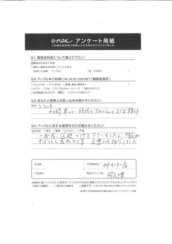 お車のご相談・ 査定だけでもOK! カンタン 入力 30秒 アップルがブランド買取始めました! お電話でも受付中! 受付時間10:00 ~ 18:30 0120-366-310 お車のご相談・ 査定だけでもOK! カンタン 入力 30秒 アップルがブランド買取始めました! お電話でも受付中! 受付時間10:00 ~ 18:30 0120-366-310 アップルがブランド買取始めました! お電話でも受付中! 受付時間10:00 ~ 18:30 0120-366-310 店舗情報 在庫車 スタッフ紹介 ブログ お客様の声 キャンペーン お得 無料査定 click お客様の声 ご記入日: 2016/12/16 S様 Q.あなたと愛車との思い出をお聞かせください!シエンタその時乗っていた時代のアルバムのような物です。Q.アップルに対する感想をぜひお書きください!一番高い値段つけて下さましたし、対応がすばらしく良かったです。友達にも紹介しました。担当スタッフ:阿久津 前へ 次へ お客様の声一覧を見る