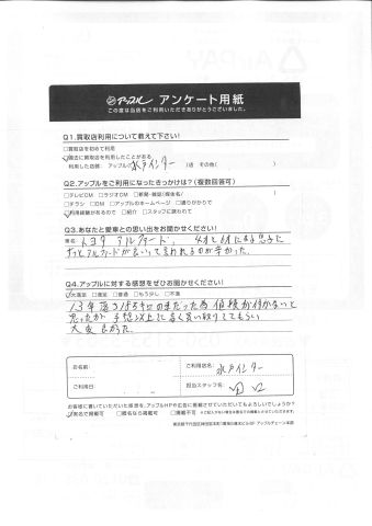 お車のご相談・ 査定だけでもOK! カンタン 入力 30秒 アップルがブランド買取始めました! お電話でも受付中! 受付時間10:00 ~ 18:30 0120-366-310 お車のご相談・ 査定だけでもOK! カンタン 入力 30秒 アップルがブランド買取始めました! お電話でも受付中! 受付時間10:00 ~ 18:30 0120-366-310 アップルがブランド買取始めました! お電話でも受付中! 受付時間10:00 ~ 18:30 0120-366-310 店舗情報 在庫車 スタッフ紹介 ブログ お客様の声 キャンペーン お得 無料査定 click お客様の声 ご記入日: 2017/03/31 K様 Q.あなたと愛車との思い出をお聞かせください!車名:トヨタ アルファード4才と6才になる息子にずっとアルファードが良いって言われるのが辛かった。Q.アップルに対する感想をぜひお書きください!13年落ち18万キロの車だった為、値段が付かないと思ったが、予想以上に高く買い取りしてもらい大変良かった。担当スタッフ:田口 前へ 次へ お客様の声一覧を見る