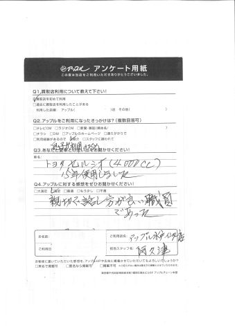お車のご相談・ 査定だけでもOK! カンタン 入力 30秒 アップルがブランド買取始めました! お電話でも受付中! 受付時間10:00 ~ 18:30 0120-366-310 お車のご相談・ 査定だけでもOK! カンタン 入力 30秒 アップルがブランド買取始めました! お電話でも受付中! 受付時間10:00 ~ 18:30 0120-366-310 アップルがブランド買取始めました! お電話でも受付中! 受付時間10:00 ~ 18:30 0120-366-310 店舗情報 在庫車 スタッフ紹介 ブログ お客様の声 キャンペーン お得 無料査定 click お客様の声 ご記入日: 2017/04/07 O様 Q.あなたと愛車との思い出をお聞かせください!車名:トヨタ セルシオ15年使用しました。Q.アップルに対する感想をぜひお書きください!親切で話し方が良い職員であった。担当スタッフ:阿久津 前へ 次へ お客様の声一覧を見る