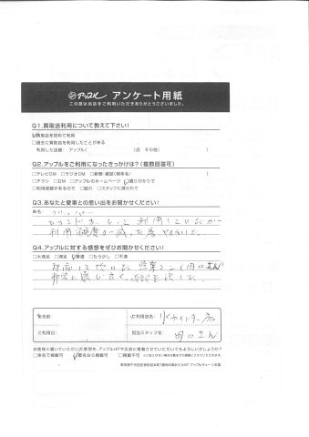 お車のご相談・ 査定だけでもOK! カンタン 入力 30秒 アップルがブランド買取始めました! お電話でも受付中! 受付時間10:00 ~ 18:30 0120-366-310 お車のご相談・ 査定だけでもOK! カンタン 入力 30秒 アップルがブランド買取始めました! お電話でも受付中! 受付時間10:00 ~ 18:30 0120-366-310 アップルがブランド買取始めました! お電話でも受付中! 受付時間10:00 ~ 18:30 0120-366-310 店舗情報 在庫車 スタッフ紹介 ブログ お客様の声 キャンペーン お得 無料査定 click お客様の声 ご記入日: 2017/04/14 Y・S様 Q.あなたと愛車との思い出をお聞かせください!車名:クリッパーセカンドカーとして利用していたが利用頻度が減った為処分した。Q.アップルに対する感想をぜひお書きください!対応して頂いた営業マン(田口さん)非常に感じ良く売却を決した。担当スタッフ:田口 前へ 次へ お客様の声一覧を見る