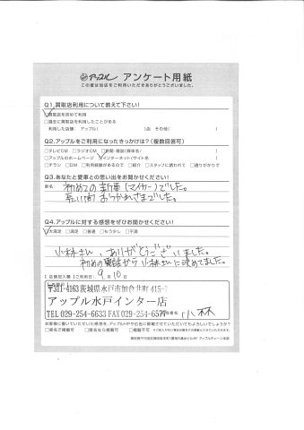 お車のご相談・ 査定だけでもOK! カンタン 入力 30秒 アップルがブランド買取始めました! お電話でも受付中! 受付時間10:00 ~ 18:30 0120-366-310 お車のご相談・ 査定だけでもOK! カンタン 入力 30秒 アップルがブランド買取始めました! お電話でも受付中! 受付時間10:00 ~ 18:30 0120-366-310 アップルがブランド買取始めました! お電話でも受付中! 受付時間10:00 ~ 18:30 0120-366-310 店舗情報 在庫車 スタッフ紹介 ブログ お客様の声 キャンペーン お得 無料査定 click お客様の声 ご記入日: 2017/03/21 A様 Q.あなたと愛車との思い出をお聞かせください!初めての新車(マイカー)でした。長い間おつかれさまでした。Q.アップルに対する感想をぜひお書きください!小林さん、ありがとうございました。初めの電話から小林さんに決めてました。担当スタッフ:小林 前へ 次へ お客様の声一覧を見る