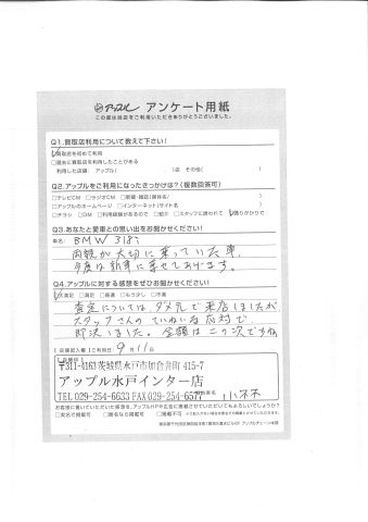お車のご相談・ 査定だけでもOK! カンタン 入力 30秒 アップルがブランド買取始めました! お電話でも受付中! 受付時間10:00 ~ 18:30 0120-366-310 お車のご相談・ 査定だけでもOK! カンタン 入力 30秒 アップルがブランド買取始めました! お電話でも受付中! 受付時間10:00 ~ 18:30 0120-366-310 アップルがブランド買取始めました! お電話でも受付中! 受付時間10:00 ~ 18:30 0120-366-310 店舗情報 在庫車 スタッフ紹介 ブログ お客様の声 キャンペーン お得 無料査定 click お客様の声 ご記入日: 2017/04/25 F様 Q.あなたと愛車との思い出をお聞かせください!車名:BMW318i両親が大切に乗っていた車今回は新車に乗せてあげます。Q.アップルに対する感想をぜひお書きください!査定についてはダメ元で来店しましたが、スタッフさんのていねいな応対で即決しました。金額は二の次ですね。担当スタッフ:小林 前へ 次へ お客様の声一覧を見る