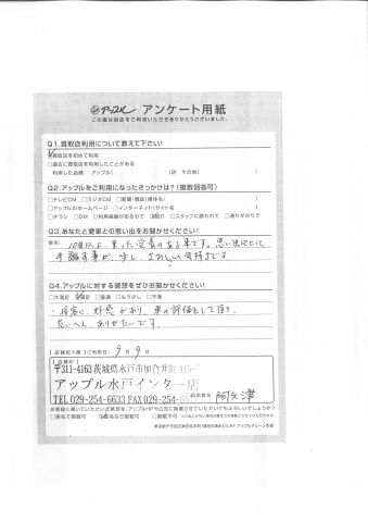 お車のご相談・ 査定だけでもOK! カンタン 入力 30秒 アップルがブランド買取始めました! お電話でも受付中! 受付時間10:00 ~ 18:30 0120-366-310 お車のご相談・ 査定だけでもOK! カンタン 入力 30秒 アップルがブランド買取始めました! お電話でも受付中! 受付時間10:00 ~ 18:30 0120-366-310 アップルがブランド買取始めました! お電話でも受付中! 受付時間10:00 ~ 18:30 0120-366-310 店舗情報 在庫車 スタッフ紹介 ブログ お客様の声 キャンペーン お得 無料査定 click お客様の声 ご記入日: 2017/05/02 H様 Q.あなたと愛車との思い出をお聞かせください!10年以上乗った愛着のある車です。思い出以上にして手離す事が少しさみしい気持ちです。Q.アップルに対する感想をぜひお書きください!接客に好感があり、車の評価をして頂き、たいへんありがたいです。担当スタッフ:阿久津 前へ 次へ お客様の声一覧を見る