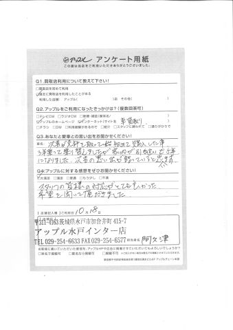 お車のご相談・ 査定だけでもOK! カンタン 入力 30秒 アップルがブランド買取始めました! お電話でも受付中! 受付時間10:00 ~ 18:30 0120-366-310 お車のご相談・ 査定だけでもOK! カンタン 入力 30秒 アップルがブランド買取始めました! お電話でも受付中! 受付時間10:00 ~ 18:30 0120-366-310 アップルがブランド買取始めました! お電話でも受付中! 受付時間10:00 ~ 18:30 0120-366-310 店舗情報 在庫車 スタッフ紹介 ブログ お客様の声 キャンペーン お得 無料査定 click お客様の声 ご記入日: 2017/05/06 J様 Q.あなたと愛車との思い出をお聞かせください!次男が免許を取って初めて購入した車3年乗って乗り換えしましたが家内が引継いで5年になりました。次男の思い出が詰まっていると思います。Q.アップルに対する感想をぜひお書きください!スタッフの皆様の対応がとても良かった。希望を聞いて頂きました。担当スタッフ:阿久津 前へ 次へ お客様の声一覧を見る