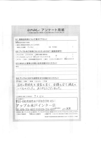 お車のご相談・ 査定だけでもOK! カンタン 入力 30秒 アップルがブランド買取始めました! お電話でも受付中! 受付時間10:00 ~ 18:30 0120-366-310 お車のご相談・ 査定だけでもOK! カンタン 入力 30秒 アップルがブランド買取始めました! お電話でも受付中! 受付時間10:00 ~ 18:30 0120-366-310 アップルがブランド買取始めました! お電話でも受付中! 受付時間10:00 ~ 18:30 0120-366-310 店舗情報 在庫車 スタッフ紹介 ブログ お客様の声 キャンペーン お得 無料査定 click お客様の声 ご記入日: 2017/05/30 M様 Q.アップルに対する感想をぜひお書きください!店内の雰囲気も良く、金額も全て満足のいくものでした。ありがとうございました。担当スタッフ:小林 前へ 次へ お客様の声一覧を見る